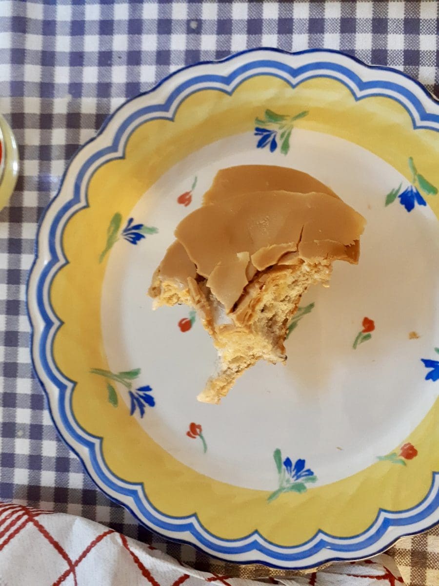Spre litt av kremen i bunnen av formen ( du har selvsagt ikke kakebunnen med ) Legg det ene sukkerbrødet oppå og dynk det med litt av plommesiruppen og melken. Ikke dynk for mye ellers blir kaken vassen.